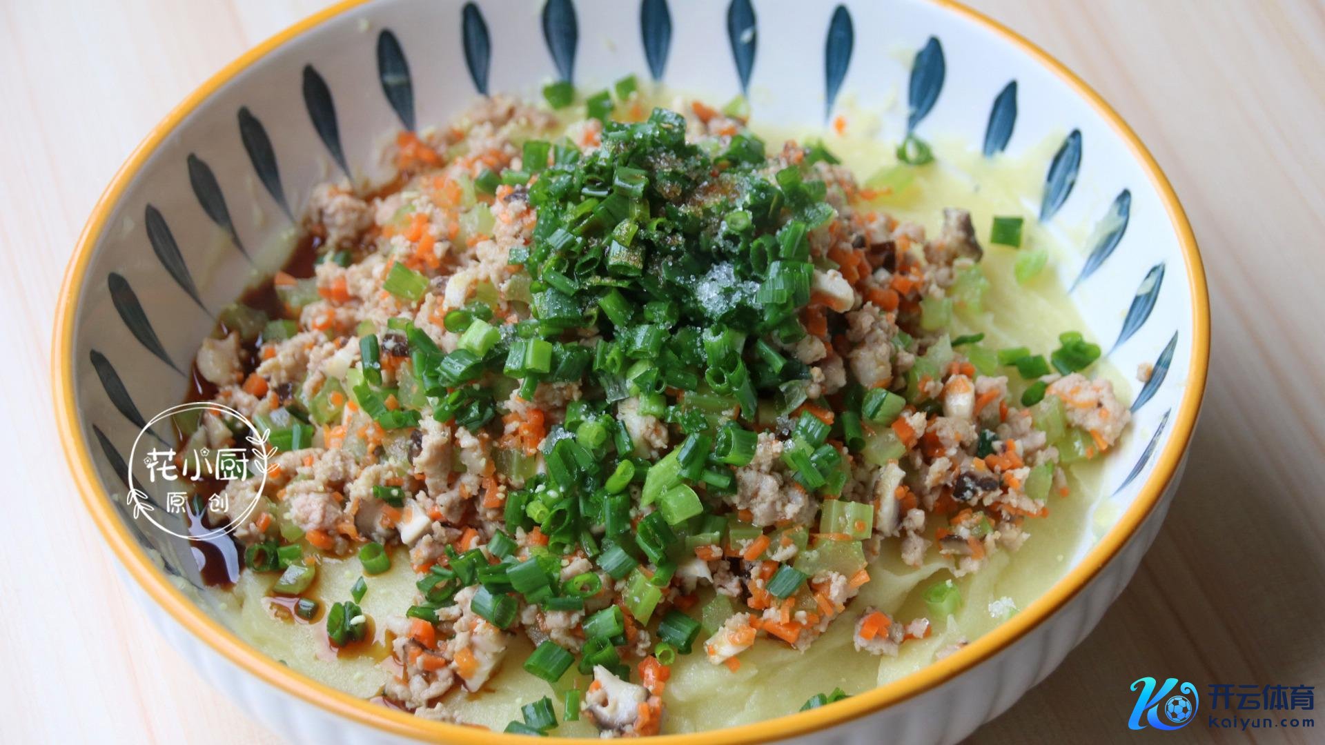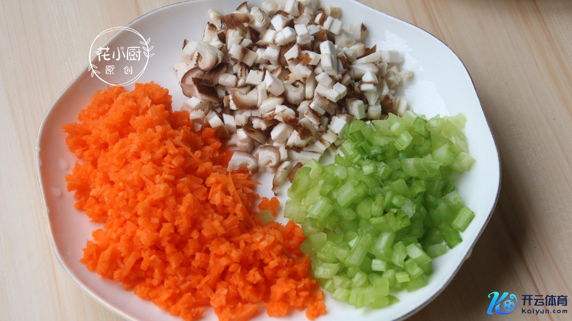 4、接着在锅里烧点水,加一丝食用油,把切好的胡萝卜丁、芹菜丁、香菇丁一股脑儿地下到锅里焯水,焯个 1 分钟就行,然后捞出来把水沥干备用。再往锅里倒点油,油热了就把肉沫放进去炒,炒到肉沫变白了,就把刚才那些配菜皆倒进锅里,一块儿翻炒均匀,然后盛出来奏凯放到里。这时辰再把葱花也加进去,驱动调味,加点盐、鸡精、生抽,再放一丝点白糖,然后用筷子搅和匀了,