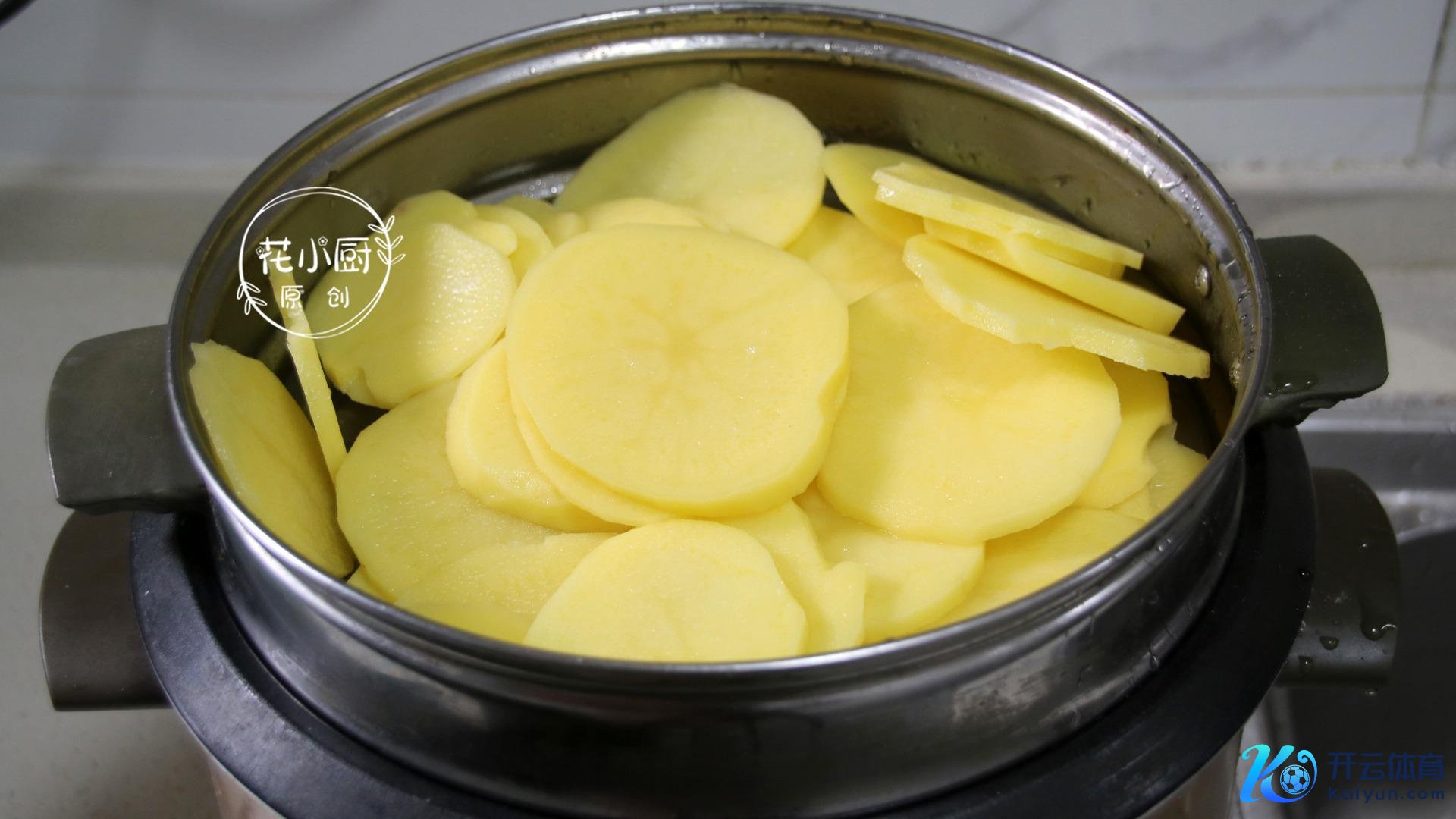 1、最初准备两三个黄心土豆,把皮刮了切成薄片,然后放在盘子里,上锅蒸个或者 15 分钟;