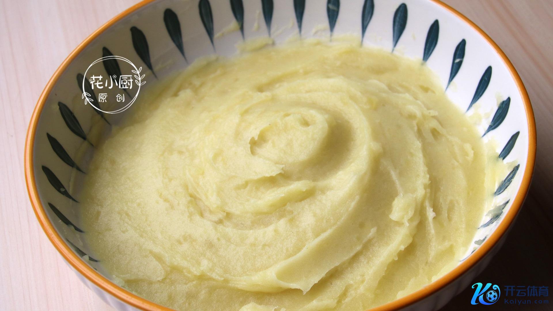 3、土豆蒸好了,把它放到一个大点儿的碗里,趁着热乎飞速压成泥,越细腻越好。