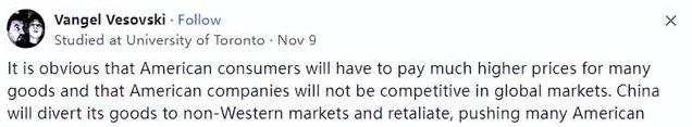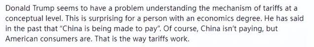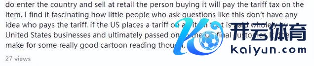 对关税的不雅点也正如名叫肯普森网友所说:此举将导致通货扩张。关税不由居品开头国支付;它们由入口商品的国度的破钞者支付。