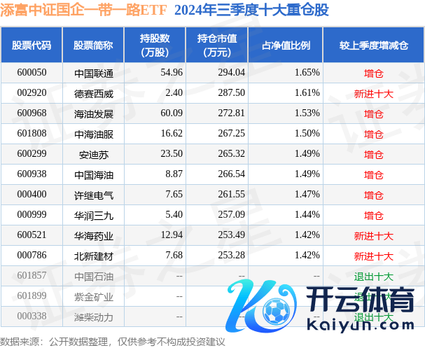 添富中证国企一带一谈ETF为指数型-股票基金,凭据最新一期基金季报泄露,该基金钞票设置:股票占净值比98.97%,无债券类钞票,现款占净值比1.12%。基金十大重仓股如下: