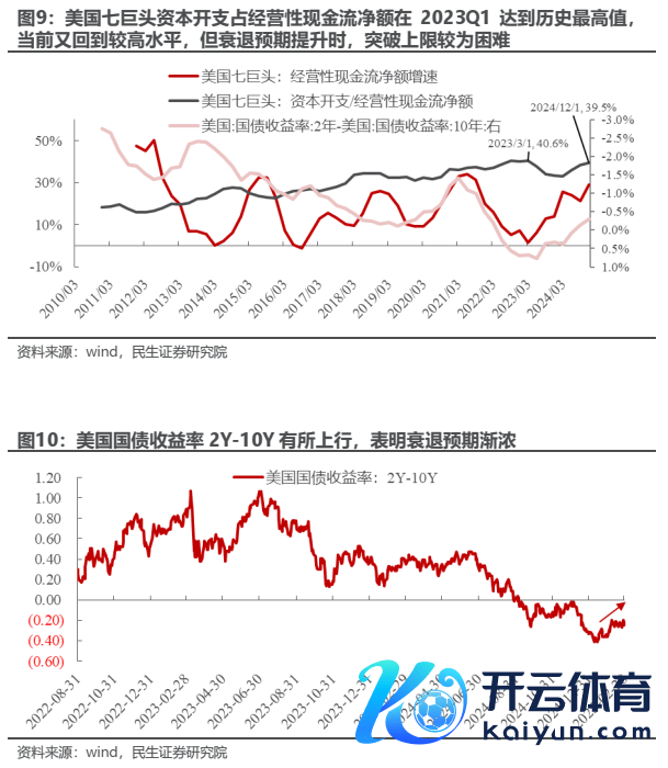 在此配景下,即使是对AI栽种分娩力有充分信心的投资者,目下也值得商酌一个风险:假如以好意思国为代表的发达经济体经济走入衰竭期,是否会影响AI产业的成本开支和景气度。咱们在前期的酬金《当AI成为焦点》中统计了好意思国科技七巨头的成本开支数额,其高增速且数额高大的投资如实拉动了从2023Q2以来的好意思国成本开支,然则这是否能够永续?尽管科技的突破和出路是成本开支的起首行者能源,但投资举止长期受到两大料理:一方面是自身传统主贸易务的造血能力,而这与总需求息息关系,另一方面则是筹资环境是否友好,而这与好意思联储的货币计谋息息关系。回到当下来看,好意思国七巨头成本开支占其诡计性现款流净值的比重在2023年Q1达到了历史最高水平(40.5%),随后因诡计性现款流净额增速放狂妄加息周期有所下滑,然后在2024年重新大幅回升至39.5%的高位水平,假定这一比例保持不变,而七巨头诡计性现款流净额增速在畴昔的4年中与好意思国国债收益率倒挂幅度(2Y-10Y)显着负关系,现时2年期与10年期好意思债的各异有所回升,衰竭预期渐浓,那么成本开支也可能因诡计性现款流增速放缓而受到挑战,尤其是在AI关系的新兴业务还未找到明确盈利方式的配景下。
