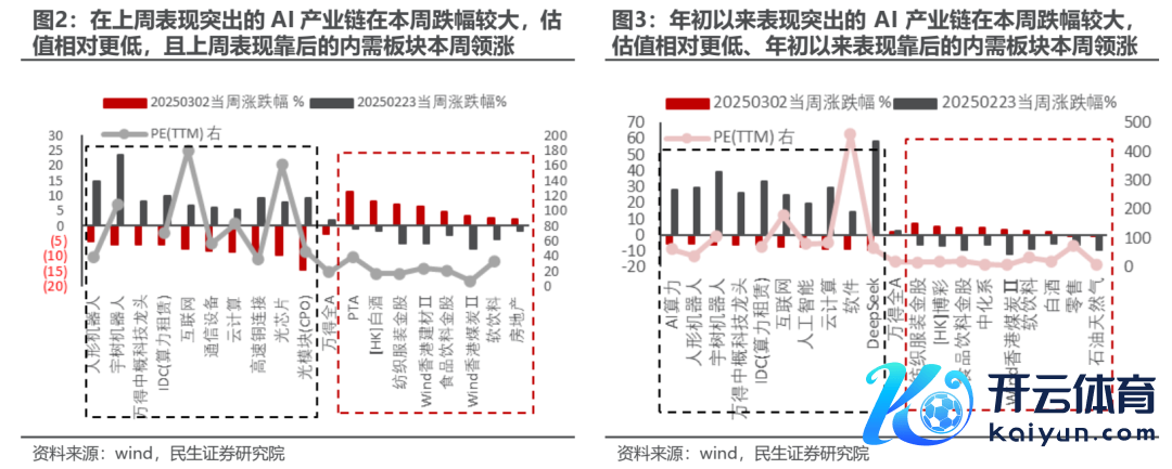 本周(20250224-20250228)市集会构上不仅出现了涨跌幅和估值的“凹凸切换”,也出现了从AI引颈的科技板块向传统内需限制切换的特征。咱们统计了万得热点见地指数涨跌幅及市盈率,并找出本周相对上周、本周相对年头以来的涨跌幅名次变化最大的见地指数,本年以来发达杰出的东谈主形机器东谈主、算力、云筹划、光模块、IDC等东谈主工智能高卑劣产业链,在本周跌幅居前,而食物饮料、白酒、纺服、房地产、煤炭、零卖等内需关系限制的涨跌幅则出现“逆袭”,这些“逆袭”的板块PE(TTM)也相对前者更低。