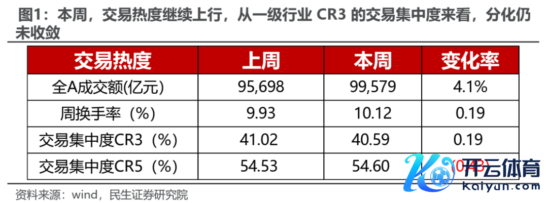 第一,中国科技股呈现订价时代段但涨幅大的特征,且各板块之间的往复热度和波动率上出现了极致的分化,从历史教养上来看,这种市集特征归并着行情的陆续性较短;而本周,全A成交额上升,换手率陆续上行,一级行业往复热度的连合度仍然处于较高水平,CR5进一步抬升,可能意味着本周固然发生了切换,但幅度还不及以使分化料理。
