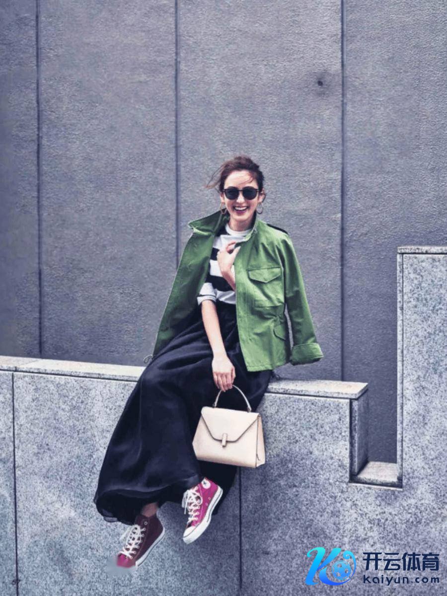 关于下半身,咱们可以取舍玄色的半身裙大意亮色的匡威鞋,这么搭配勤俭而有范儿,同期又不失芳华活力。
