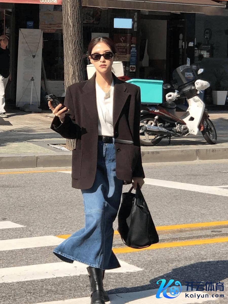 单穿一件西装上衣,再搭配半身裙和尖头鞋,既安静又带着高品尝,相等允洽轻熟女。