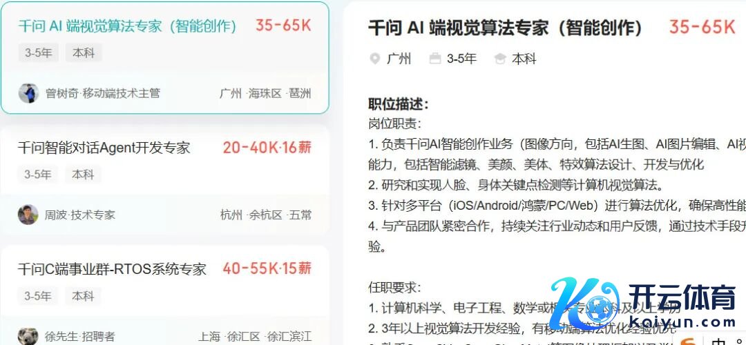《21CBR》记者发现,3月6日,在BOSS直聘上,阿里更新岗亭信息,如千问智能对话Agent开刊行家、AI图像&视频剪辑研发等。其中,视觉算法行家岗亭,开出最高6.5万的月薪。