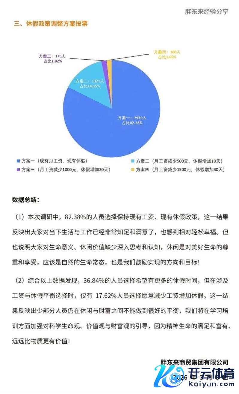 前些天,胖东来想给职工增多一些假期并裁减相应工资,让职工投票决定。投票效果却出乎预料,82.38%的职工聘请防守现存假期策略,16.72%的职工倾向于增多放假天数。