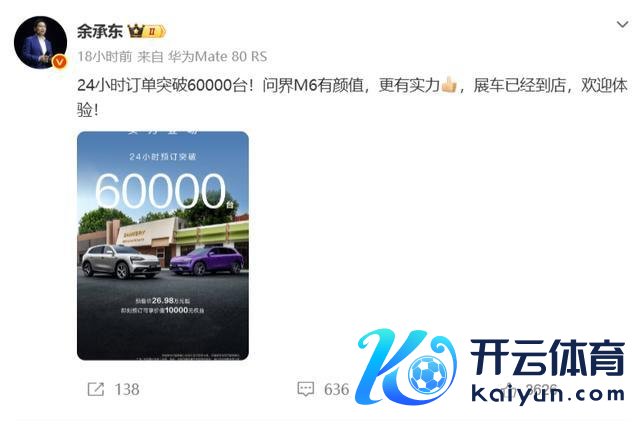 2026年3月24日,华为常务董事、末端BG董事长余承东在个东谈主外交媒体上暗示:开启预订仅24小时,问界M6的订单量便冲突了60000台 。同期,其还暗示现金九游体育app平台,问界M6有颜值,更有实力。音信一出,引起了较高的怜惜。