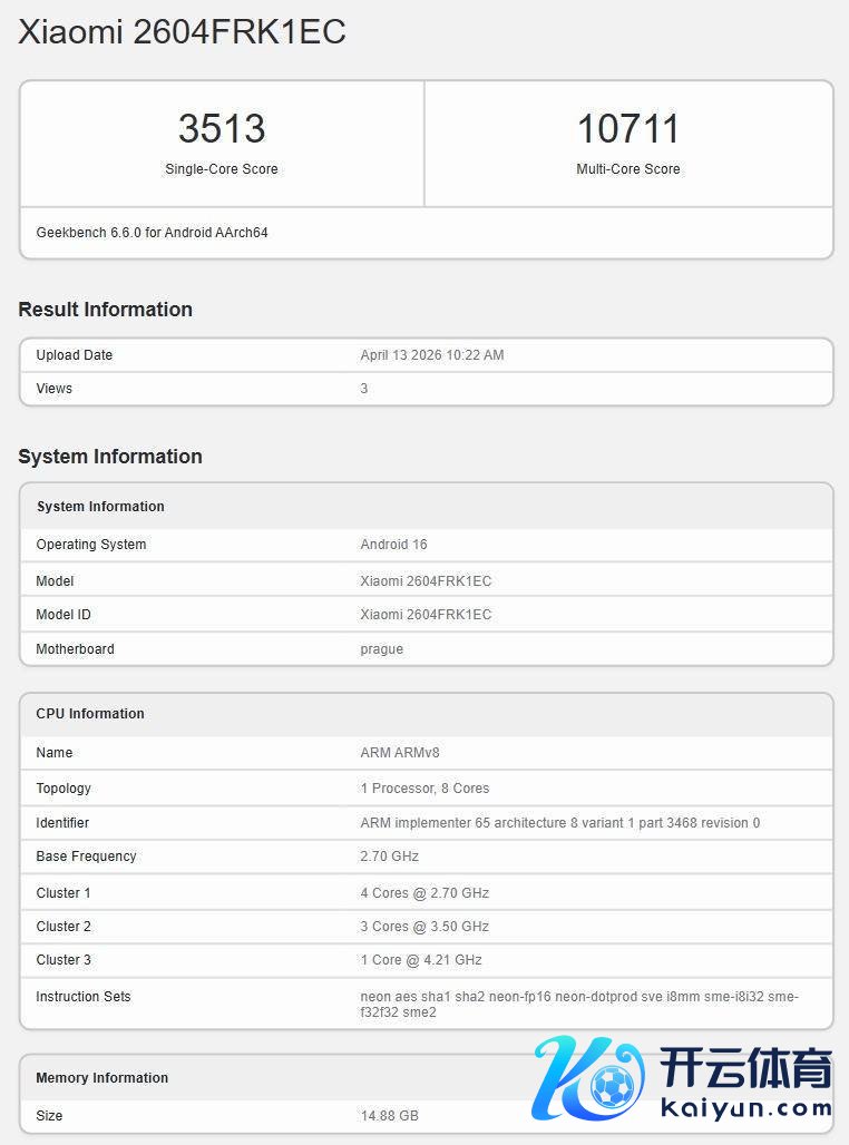 此前,型号为2604FRK1EC的小米新机已在Geekbench跑分数据库现身,其6.6.0版块单核收获达3513分现金九游体育app平台,多核收获打破10711分,性能阐述处于行业跨越水平。聚拢GSMA IMEI数据库信息,可说明该机型即为行将发布的REDMI K90 Max。这款新机将于4月21日肃肃亮相,其革命性的散热处分决策和超长续航才智,有望为高端智妙手机商场带来新的竞争神志。
