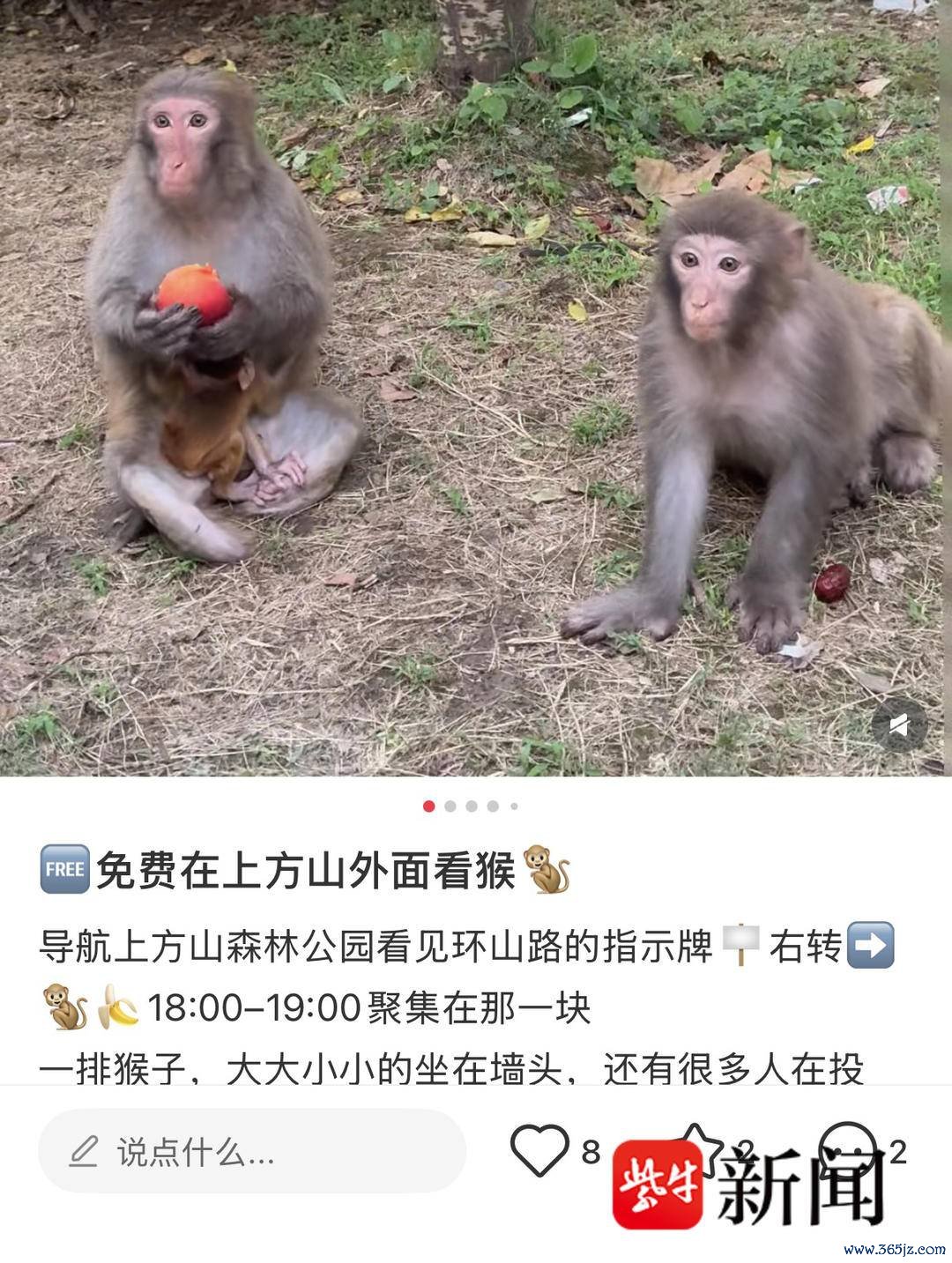 据多位网友反应,在苏州上方山丛林公园环猴子路往往碰见野猴群出没,期间多荟萃在中午和傍晚。“毋庸买票进去,马路控制就能免费看到猴子。”联系图文在采集上飞速传播,诱骗不少市民搭客专程赶赴“打卡”。